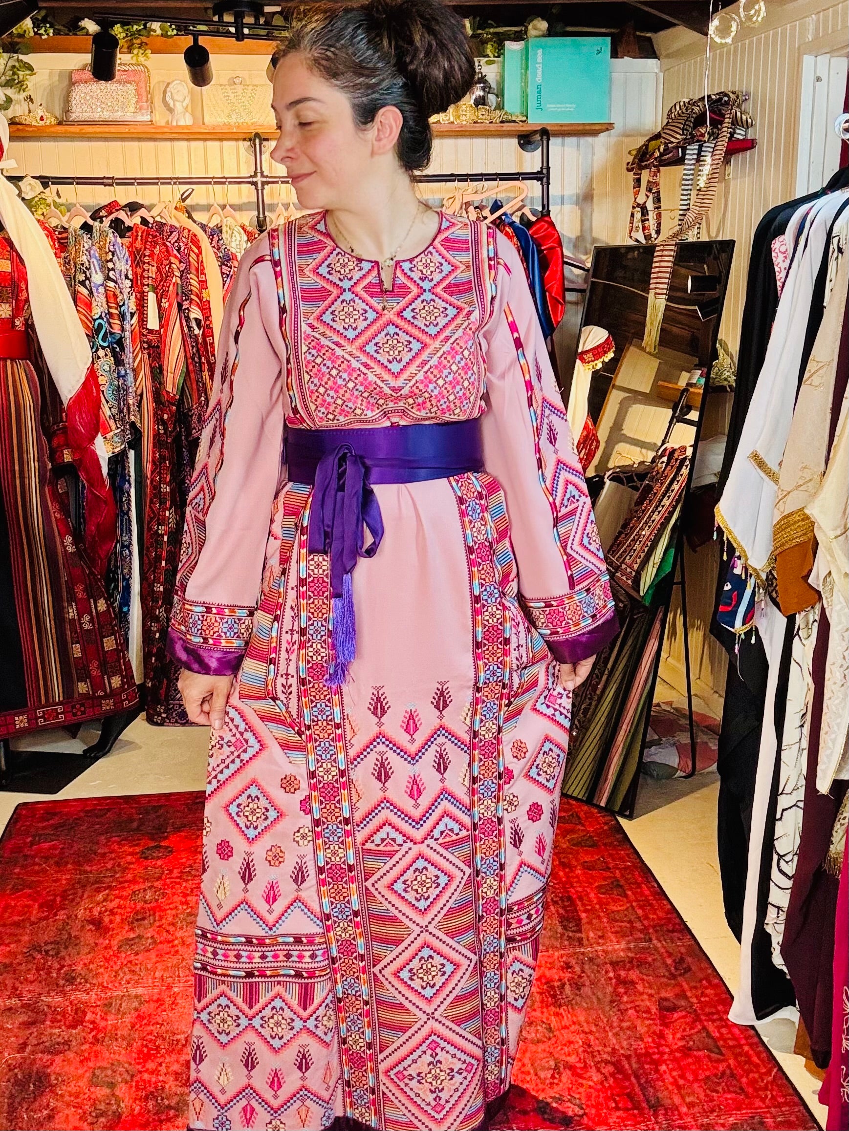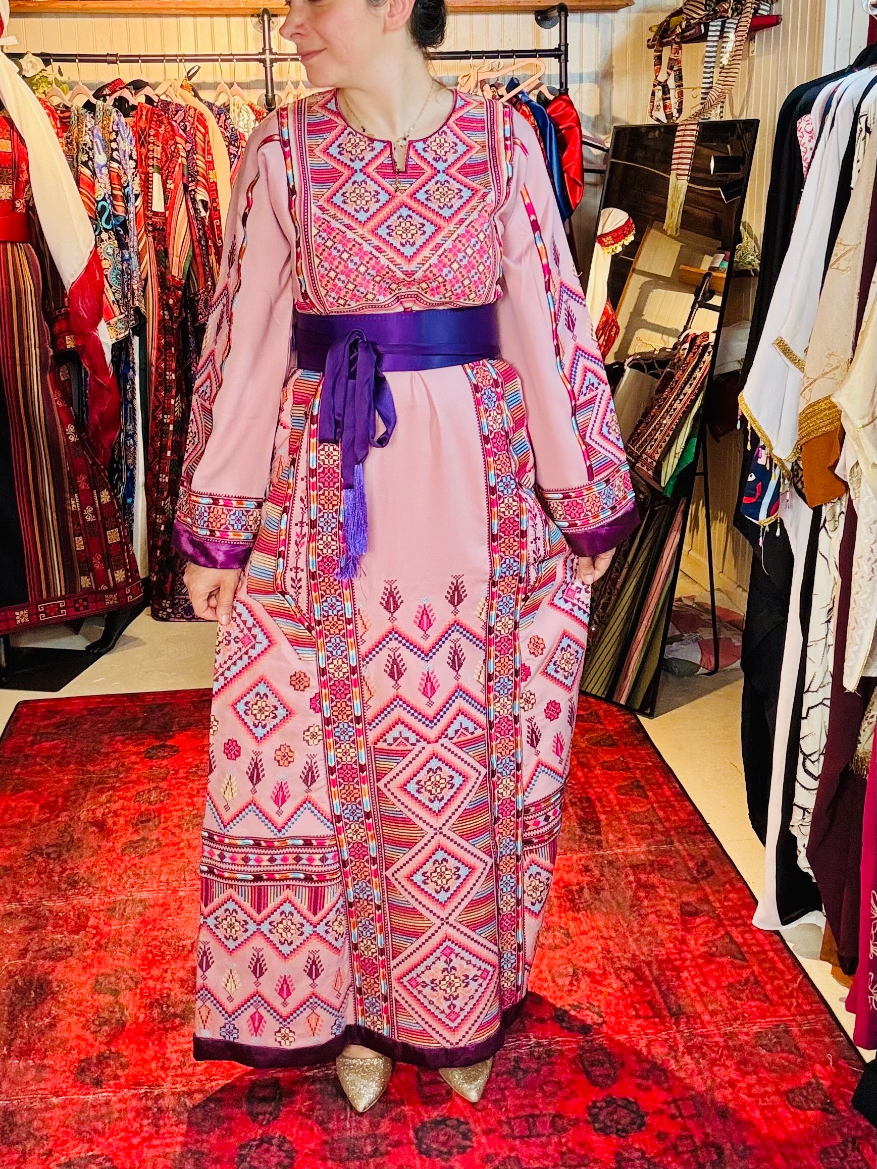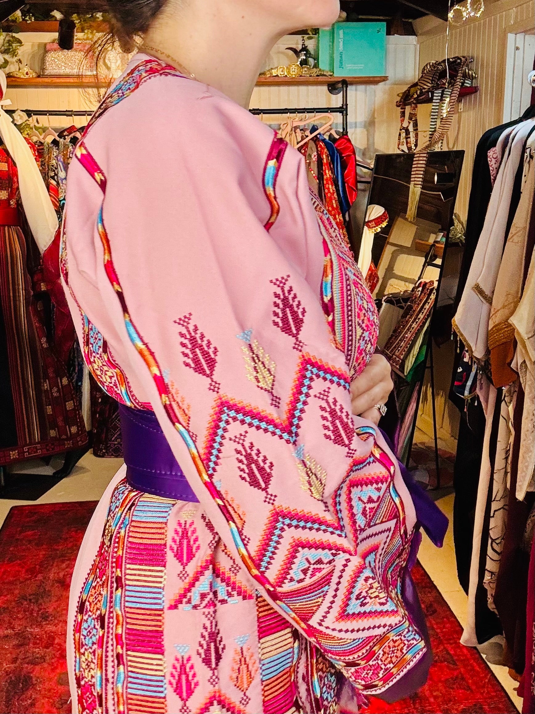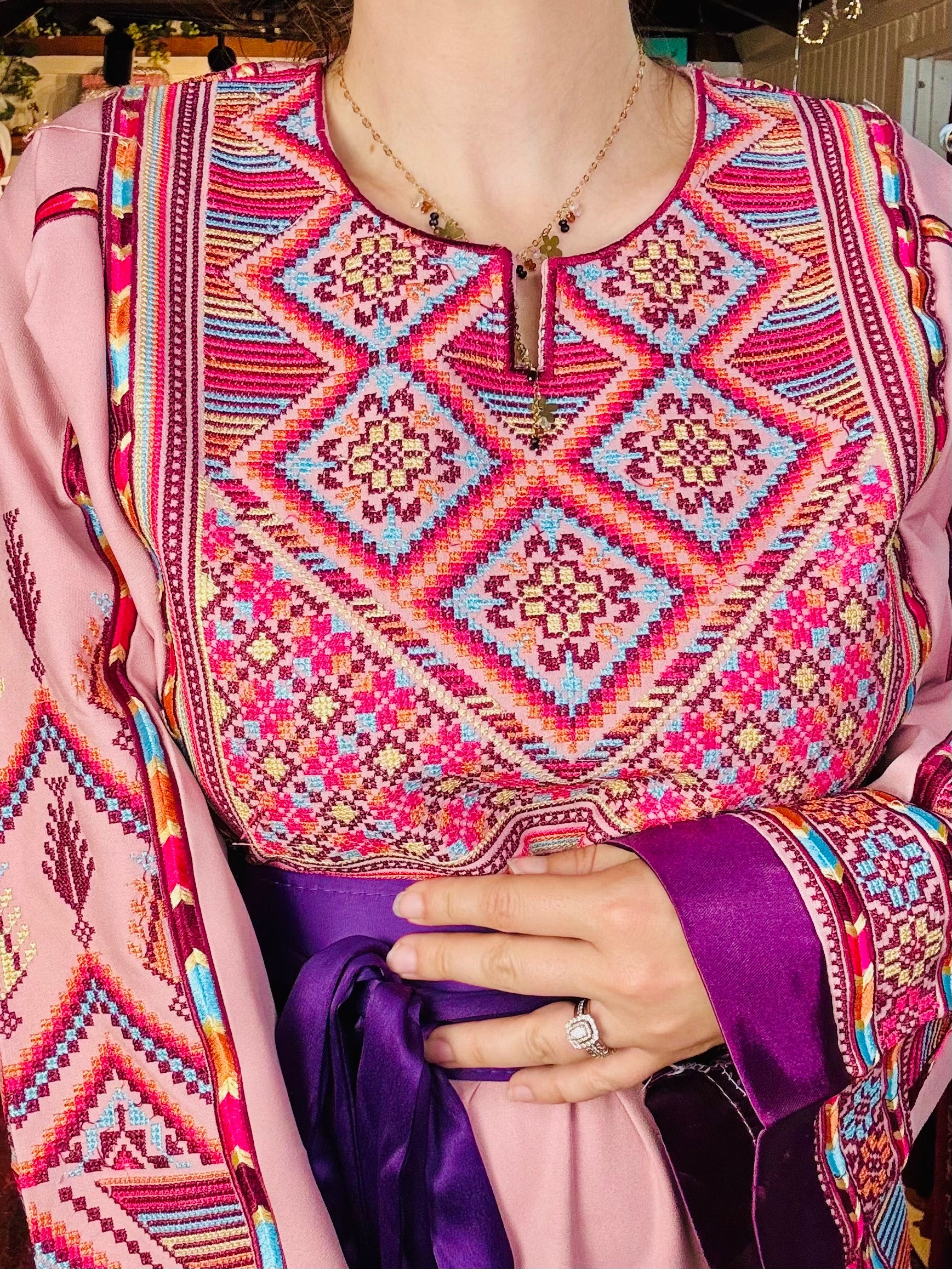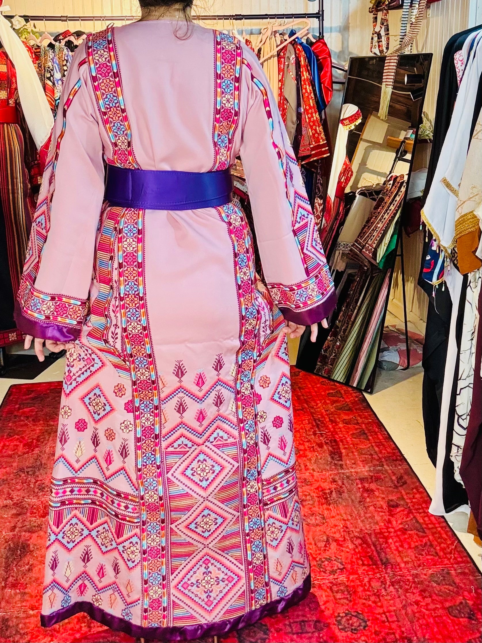 Radiating femininity and heritage, this pink-based thoub is a delicate fusion of tradition and elegance. Hand-embroidered with care, the intricate tatreez patterns contrast beautifully against the soft blush tone, creating a look that is both gentle and powerful. Each stitch reflects the artistry of Palestinian women preserving centuries-old techniques. Light, graceful, and deeply rooted—this piece is perfect for those who carry their culture with quiet pride and undeniable presence.