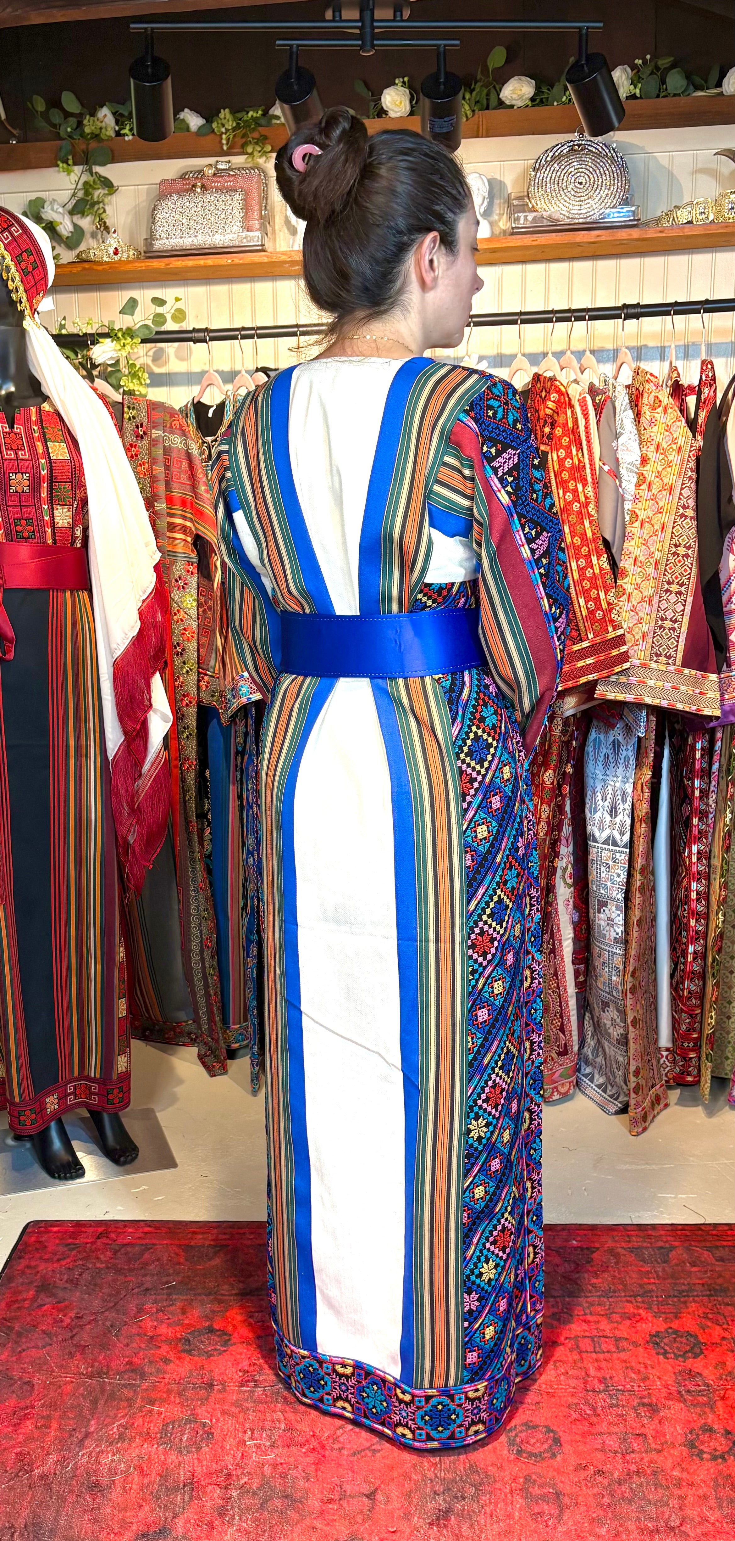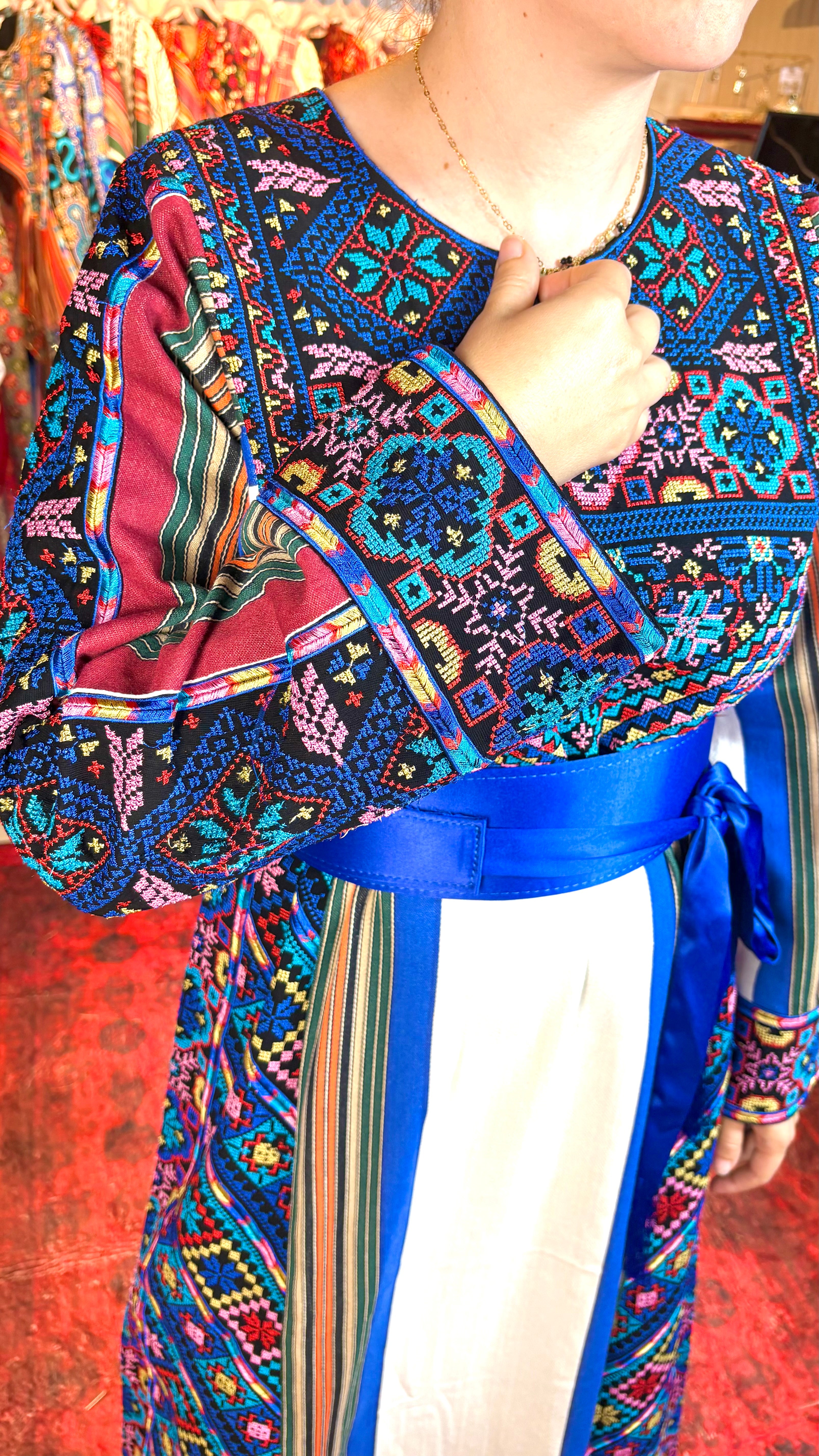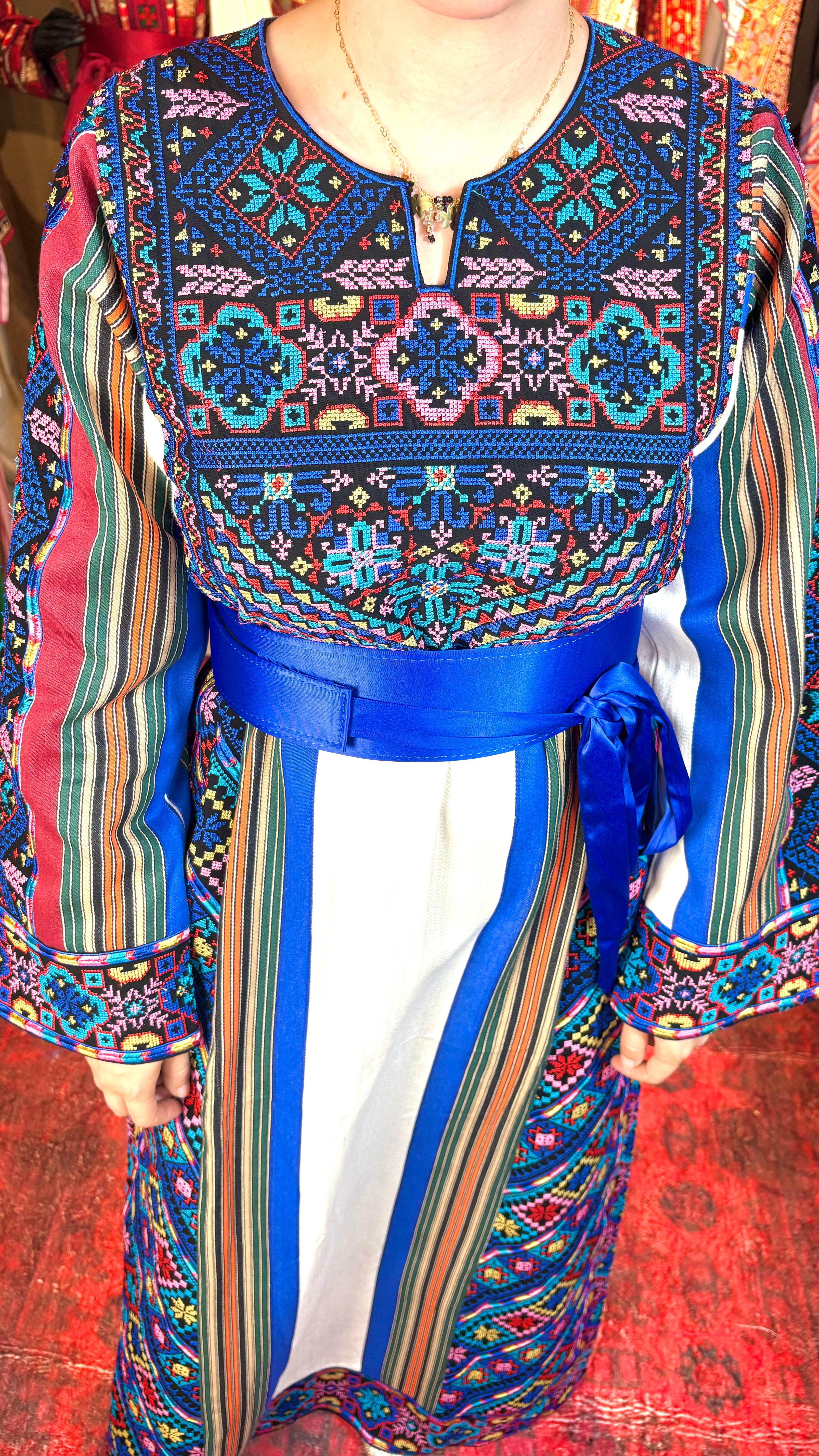 This exquisite thoub unites the timeless beauty of Majdalawi handwoven fabric with intricate Jerusalem-style tatreez, known for its symbolic motifs and refined detailing. The shimmering silk stripes of the Majdalawi weave reflect heritage and elegance, while the Jerusalem embroidery—often inspired by the city’s arches, olive branches, and cypress trees—adds a sacred, storytelling touch. Crafted with devotion, this piece embodies the spirit of Al-Quds—resilient, sacred, and unforgettable.