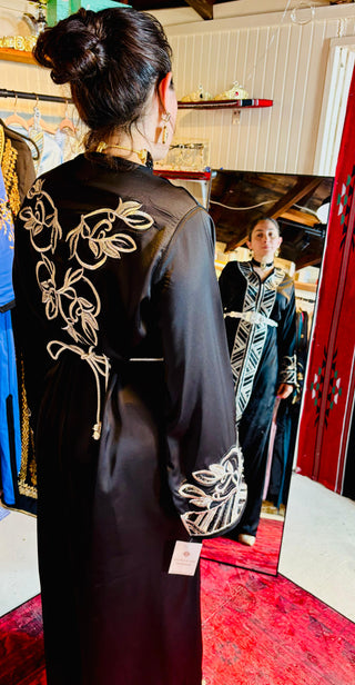 Black Handcrafted Moroccan Kaftan - Traditional Design with Geometric Patterns and Elegant Accessories