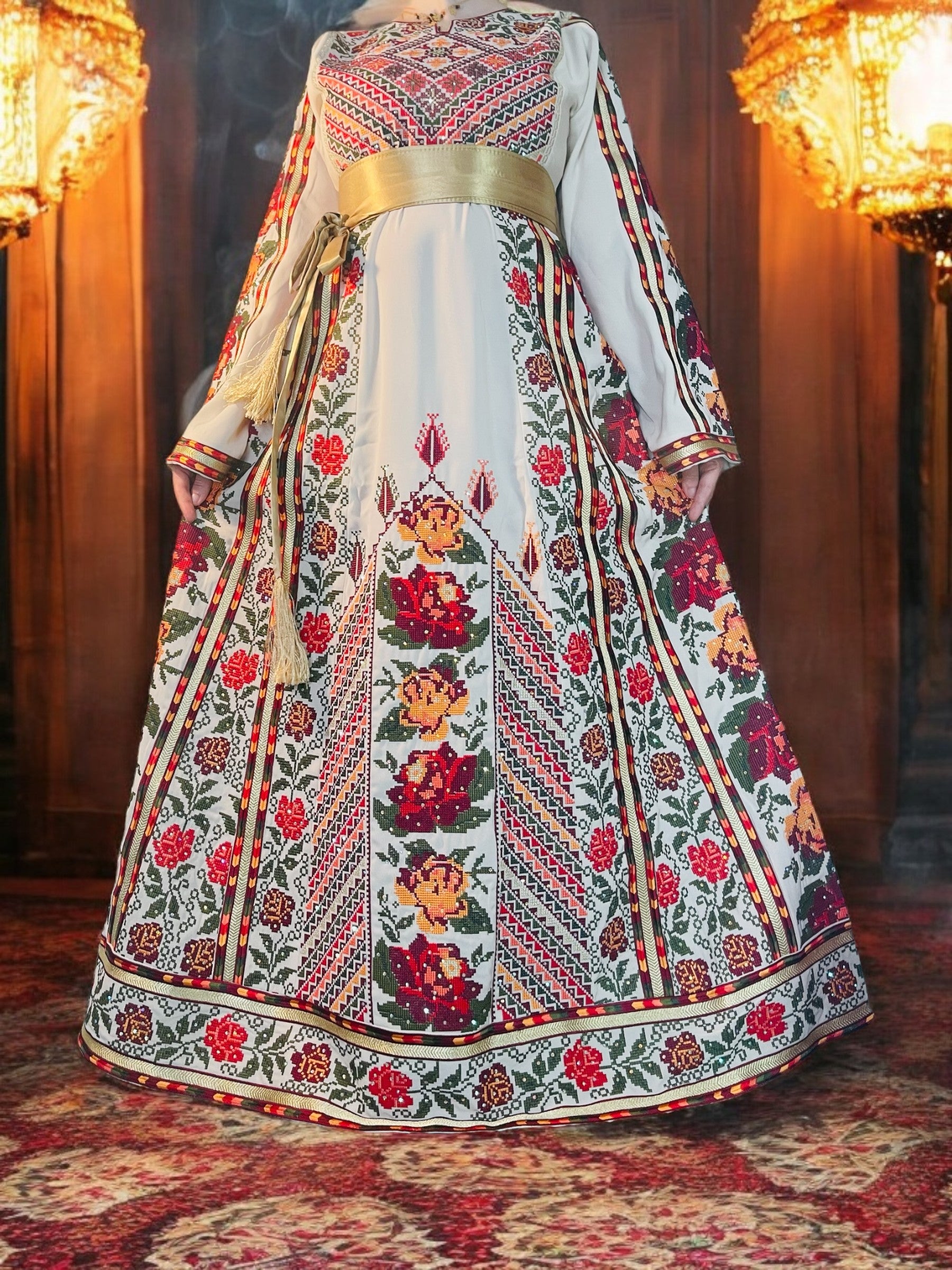Introducing Thobe Al-Warda, the luxurious evening dress designed with a princess cut and intricate Palestinian embroidery. Crafted with high quality materials, this dress exudes elegance and sophistication. Elevate your evening attire with this beautifully crafted dress.